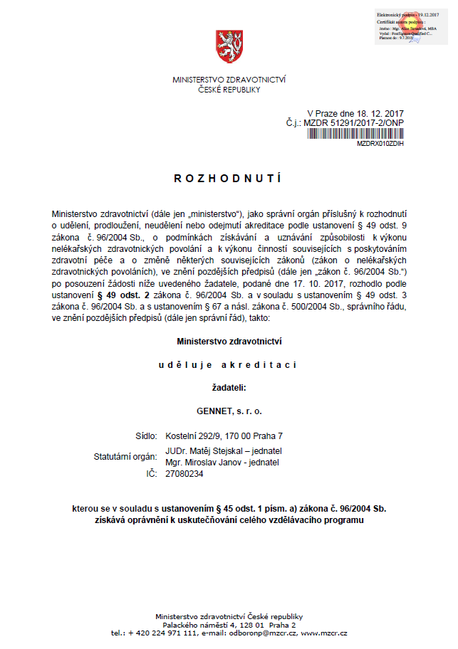 Více informací o udělení akreditace naleznete v rozhodnutí Ministerstva zdravotnictví České Republiky.