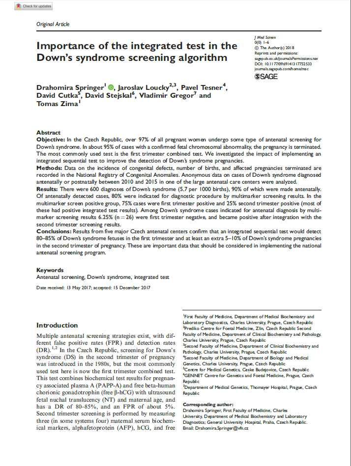 Objective In the Czech Republic, over 97% of all pregnant women undergo some type of antenatal screening for Down's syndrome. In about 95% of cases with a confirmed fetal chromosomal abnormality, the pregnancy is terminated. The most commonly used test is the first trimester combined test. We investigated the impact of implementing an integrated sequential test to improve the detection of Down's syndrome pregnancies. Methods Data on the incidence of congenital defects, number of births, and affected pregnancies terminated are recorded in the National Registry of Congenital Anomalies. Anonymous data on cases of Down's syndrome diagnosed antenatally or postnatally between 2010 and 2015 in one of the large antenatal care centers were analyzed. Results There were 600 diagnoses of Down's syndrome (5.7 per 1000 births), 90% of which were made antenatally. Of antenatally detected cases, 80% were indicated for diagnostic procedure by multimarker screening results. In the multimarker screen positive group, 75% cases were first trimester positive and 25% second trimester positive (most of these had positive integrated test results). Among Down's syndrome cases indicated for antenatal diagnosis by multimarker screening results 6.25% (n = 26) were first trimester negative, and became positive after integration with the second trimester screening results. Conclusions Results from five major Czech antenatal centers confirm that an integrated sequential test would detect 80-85% of Down's syndrome fetuses in the first trimester and at least an extra 5-10% of Down's syndrome pregnancies in the second trimester of pregnancy. These are important data that should be considered in implementing the national antenatal screening program.